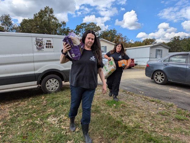 The first delivery of donated supplies from True Rescue arrived just in the nick of time at the Madison County Animal Shelter. People and Rescues were waiting to get the food as fast as we could unload it. While we were unloading, intakes started arriving as roads opened up and people found their way to open animal shelters. Some animals were surrendered and sent to our facility to make room at the shelter for all the intakes. Madison County gave us permission to assist the Executive Director with helping to organize and set up the shelter, preparing for the influx of animals coming. We also assisted our dear friends at Sister Kitten helping the displaced cats/kittens of Asheville as well as continued care for their colonies and properties that were damaged.